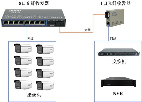 介绍一个很常用的光纤收发器的用法,8口对1口组网,8口光纤收发器可以接8个摄像头,不需要另外加一台交换机,通过光口传输到1口光纤收发器光口上,转出网口接入交换机或NVR。
