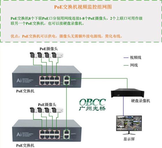 PoE交换机8个下联PoE口分别用网线连接1-8个PoE摄像头,2个上联口可用作级联另一个PoE交换机,也可以接硬盘录像机。